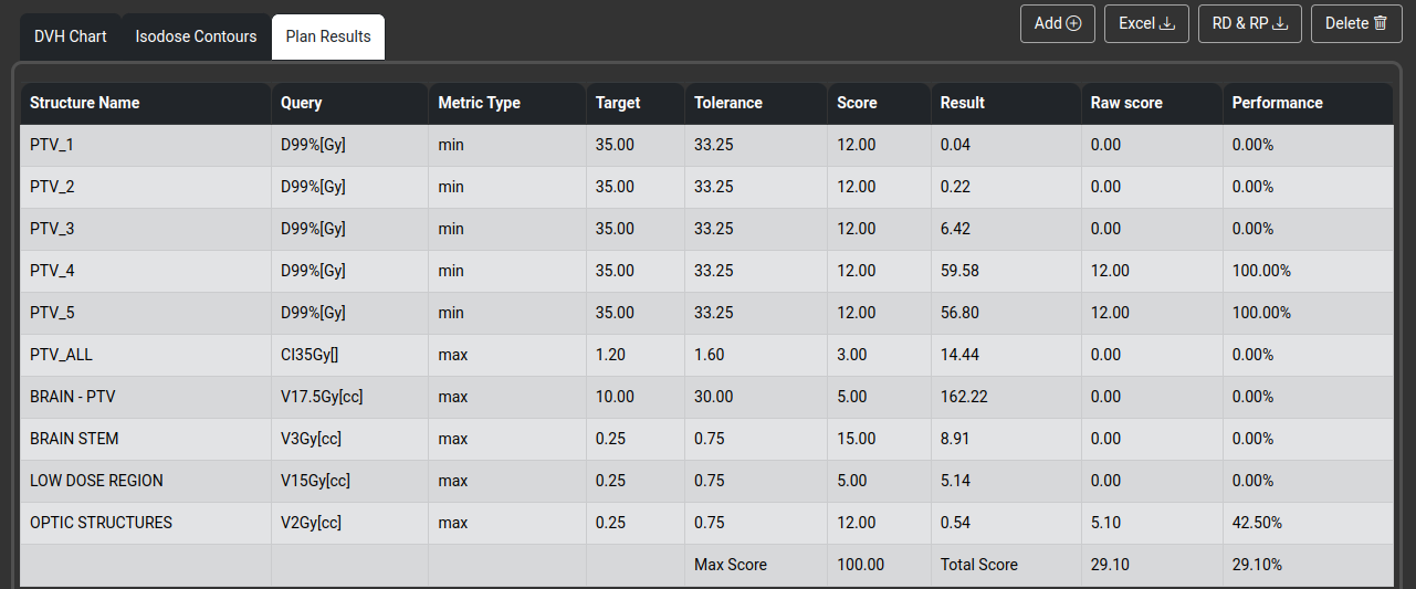 Plan Score is a specialized evaluation tool for radiotherapy planning that processes RTPlan and RTDose files for a case, it delivers a clear raw score and detailed performance metrics — giving you a fast, objective measure of treatment plan quality.